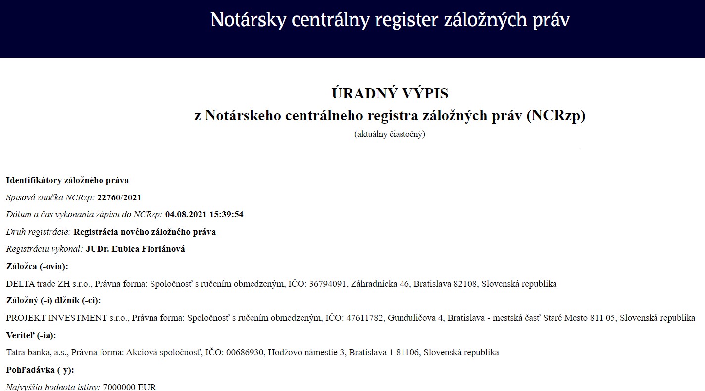 Úradný výpis z NCRzp na 7 miliónovú peňažnú pohľadávku dlžníka PROJEKT INVESTMENT sro a záložcu DELTA trade ZH sro / zdroj: Notársky centrálny register záložných práv