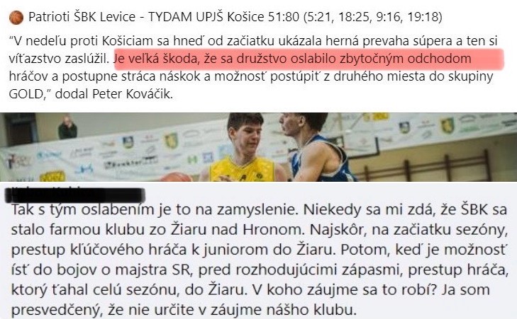 Vyjadrenie trénera a fanúšika Levíc k odchodom hráčov do Žiaru zo dňa 12.3.2024/ zdroj: FB ŠBK Junior Levice