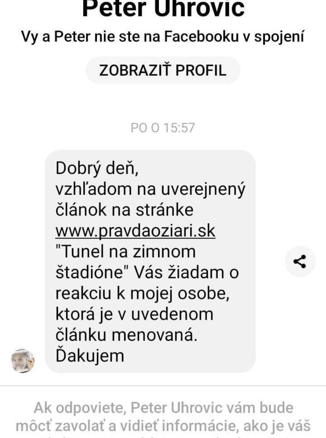 Správa Petra Uhroviča ľuďom, ktorí dali like pod článok o tunelovaní / zdroj: správa od P.Uhroviča/