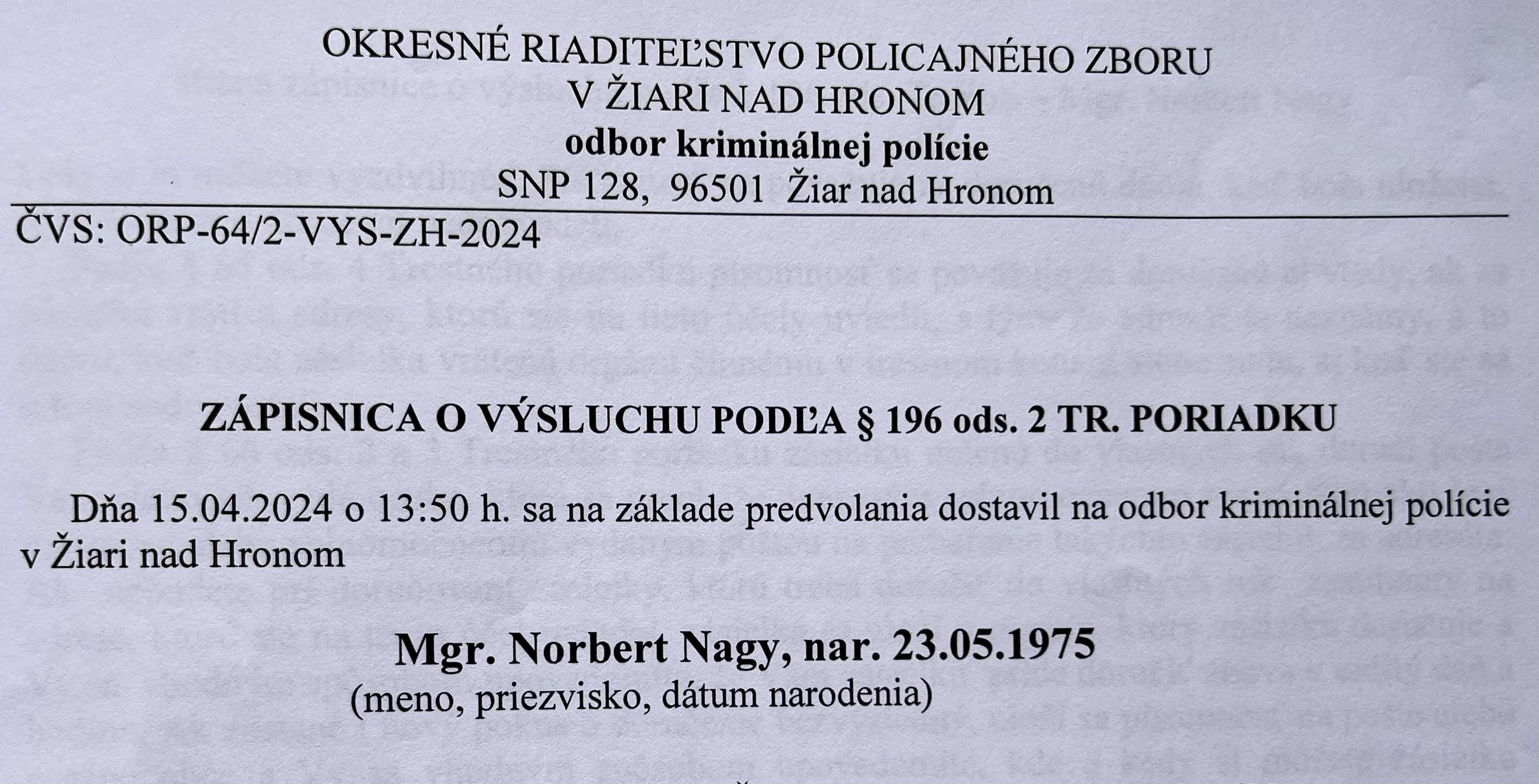 Zápisnica o výsluchu k TO podanému mestom Žiar nad Hronom/ zdroj: zápisnica o výsluchu zo dňa 15.4.2024