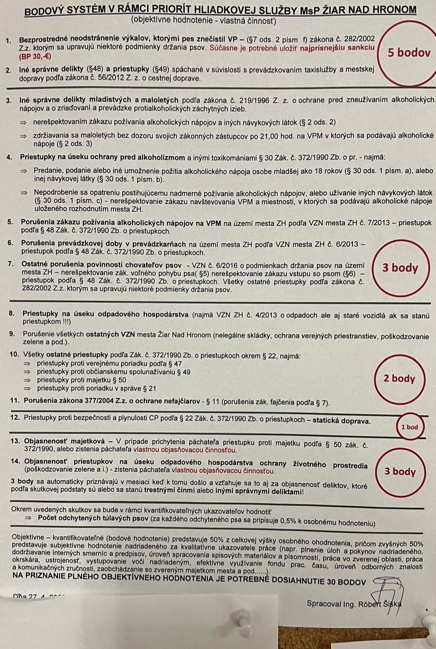 Bodový systém R.Šišku pre určenie prémií mestských policajtov v Žiari nad Hronom / zdroj_Bodový systém na nástenke MsP Žiar nad Hronom