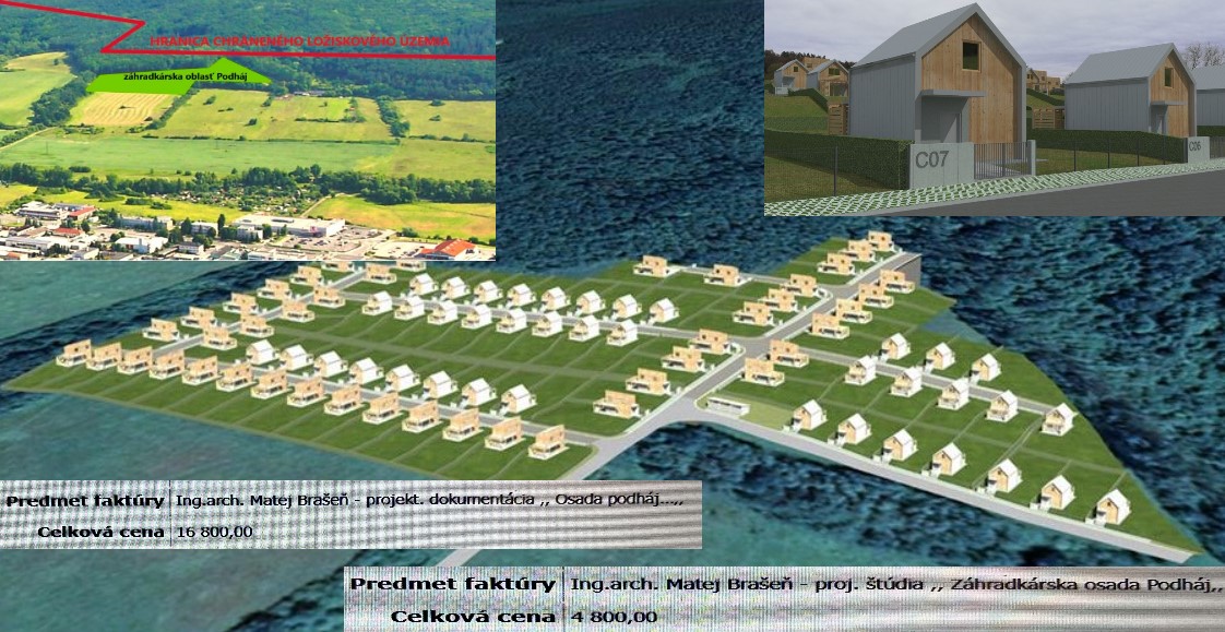 Ukážky štúdie záhradkárskej osady PODHÁJ, lokalizácia PODHÁJA a chráneného ložiskového územia, faktúry za projekt / zdroj: web mesta, zbgis.skgeodesy.sk a Pravda o Žiari