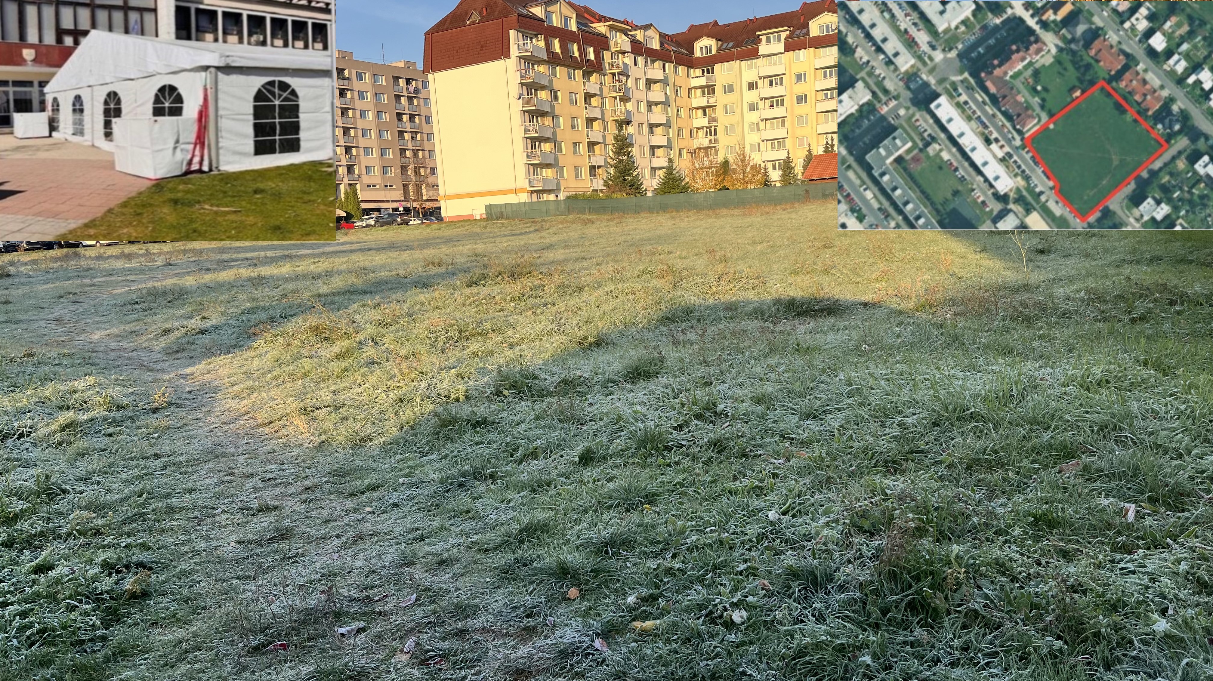 Prázdny pozemok na Podvrškoch predaný spoločnosti REALINVEST SK a jej propagačný stan na žiarskom námestí / zdroj: FB Mesta Žiar nad Hronom, web mesta a Pravda o Žiari