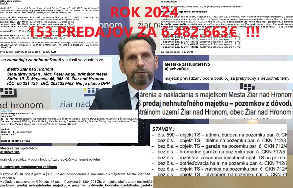 - Poslanci mesta Žiar nad Hronom na návrh primátora Petra Antala schválili v roku 2024 spolu 153 predajov „prebytočného“ majetku mesta.
