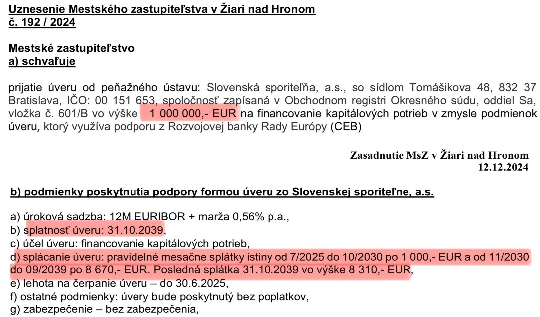 Na konci minulého roka poslanci potichu a bez diskusie schválili návrh ekonóma mesta Martina Majerníka a primátora Petra Antala, schvaľujúci prijatie úveru od Slovenskej sporiteľne vo výške 1 milión eur. Splatnosť úveru je schválená do 31.10.2039, teda na 15 rokov. Účel je úplne všeobecný, na „financovanie kapitálových potrieb“. Lehota na čerpanie úveru mesta je do 30.6.2025. Úplne šokujúce je splácanie úveru: pravidelné mesačne splátky istiny od júla 2025 do októbra 2030 len po 1 000,- eur a od novembra 2030 do októbra 2039 po takmer 8 700,- eur. Poslanci tento bianco šek svojmu šéfovi ako uznesenie č.192/2024 dňa 12.12.2024 jednohlasne schválili. Na čo sa milión použije, vie len Antal s Majerníkom. Že ho budú splácať dlhých 15 rokov aj budúci primátori mesta, ich absolútne nezaujíma. Odložiť si reálnu splátku istiny miliónového úveru až o 5 rokov, je v samospráve drzosť najhrubšieho zrna. Zatiaľ sa bude splácať „bezbolestne“ len tisícka mesačne. Ďalší primátor bude už ale mesačne cvakať skoro 9 násobne viac! No a čo. Ekonóm mesta už vtedy bude na dôchodku v Lovčici Trubín, kde býva. Antal bude na svojej milionárskej haciende v Krupine. Aj terajší žiaci materských a základných škôl sa budú ale na tieto pochybné kšefty do rozpočtu mesta ako budúci občania mesta musieť zo svojich daní zbierať.