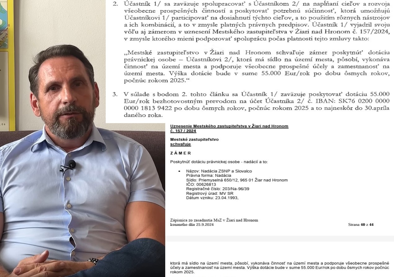 Príhovor Petra Antala k financovaniu sáun 22.8.2024, zmluva Mesta s nadáciou z 24.3.2025 a uznesenie MsZ v Žiari nad Hronom č.157/2024/ zdroj: FB Peter Antal – Primátor Žiaru nad Hronom a web mesta