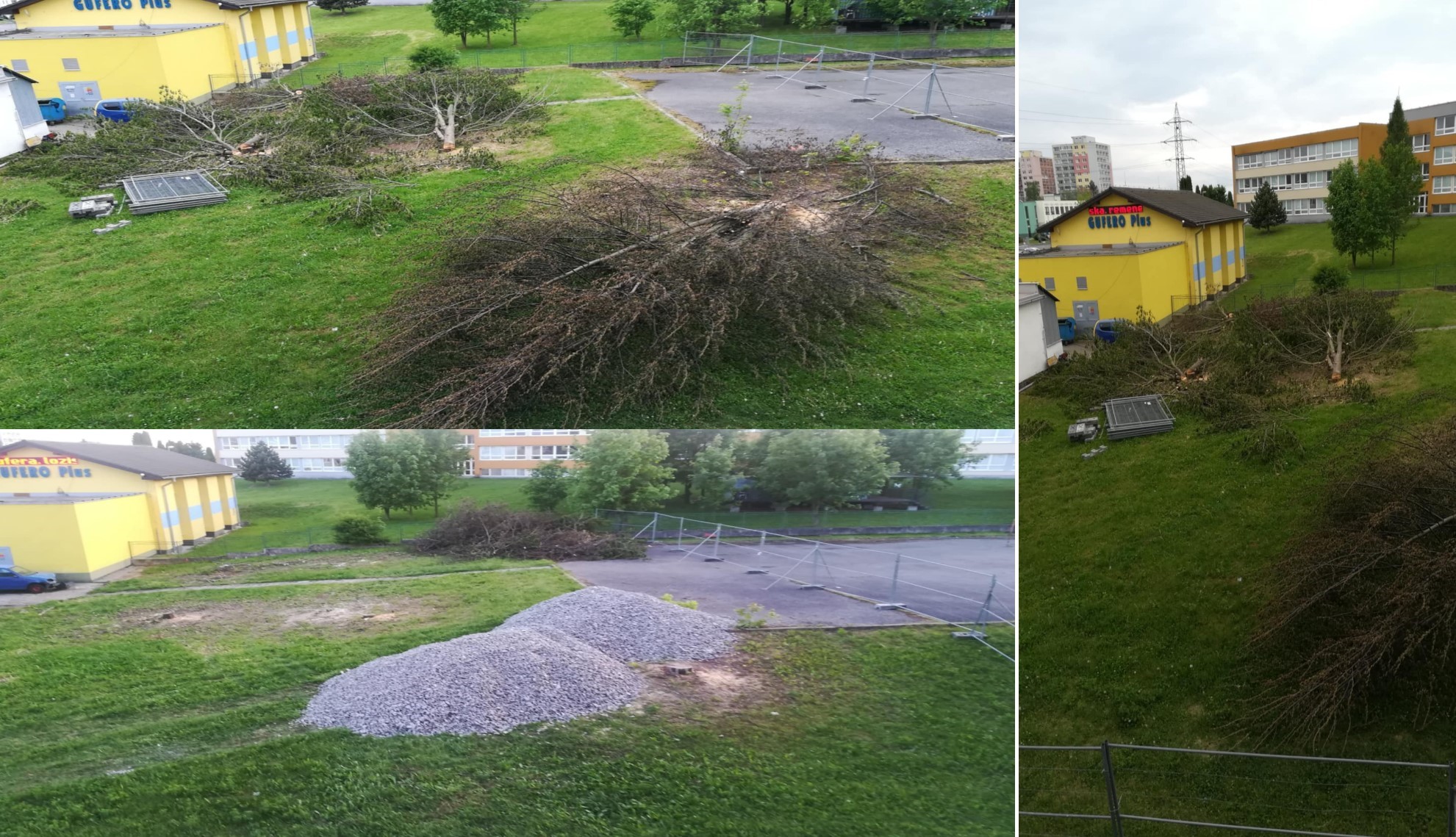 Stromy spílené v rozpore so zákonom 29.apríla 2025 a stavebné prípravy pred bytovým domom 595 na Ul.SNP / zdroj: foto Pravda o Žiari