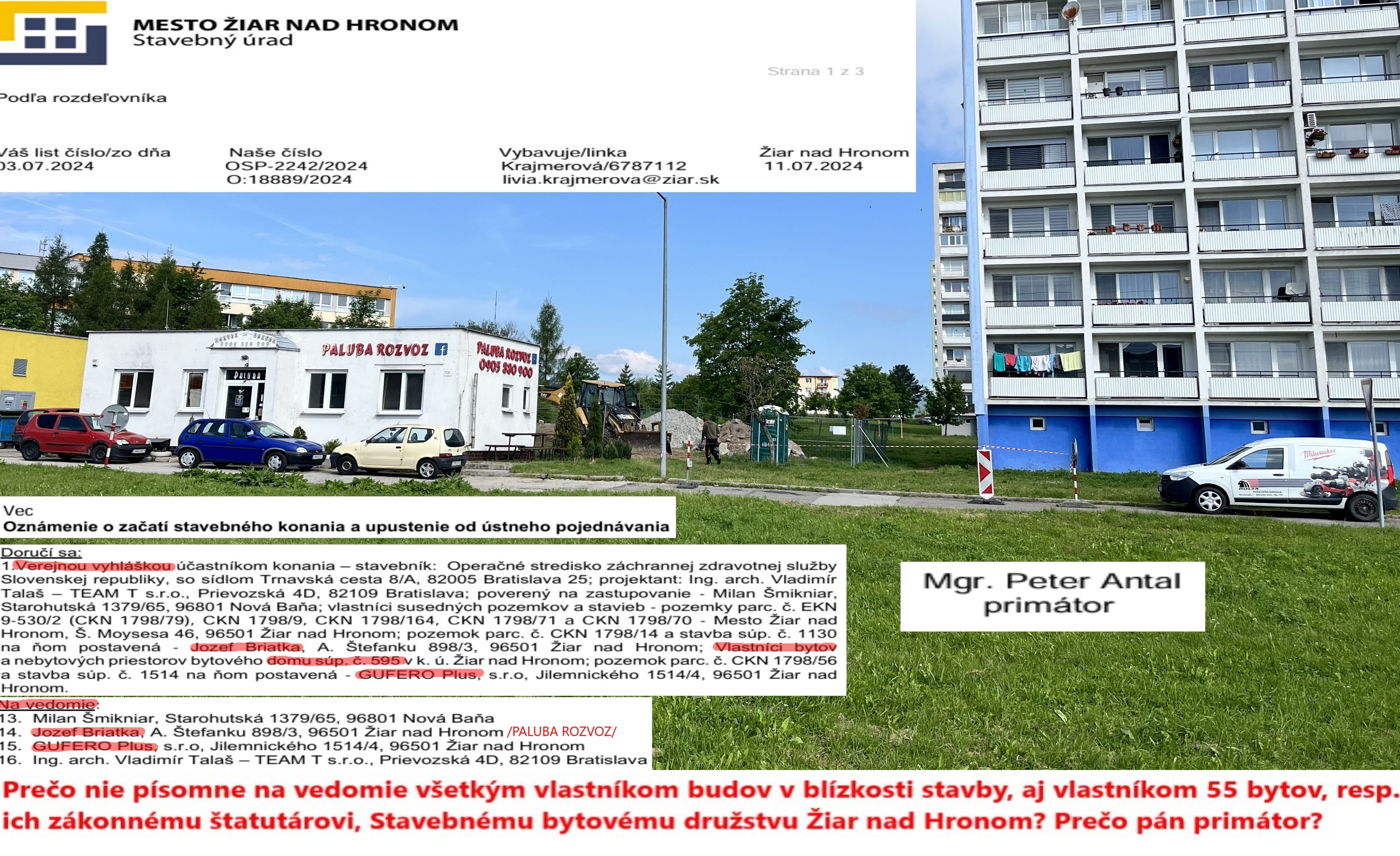 - 11.7.2024 Stavebný úrad Mesta Žiar nad Hronom Oznámenie o začatí stavebného konania, podpísané primátorom Petrom Antalom, doručil účastníkom konania, teda aj susediacim vlastníkom pozemkov alebo stavieb len formálne. Takzvanou verejnou vyhláškou, teda na jednom papieri vyvesenom na tabuli pred mestským úradom a na úradnej tabuli mesta na webovej stránke mesta. Teda tam, kde sa uverejňujú desiatky rôznych nepodstatných oznamov a takmer nikto si ich nepozerá. Riadne, teda písomne na vedomie, dostali oznámenie záhadne len len dvaja z troch vlastníkov nehnuteľnosti, susediacej s pozemkom, na ktorom má ZZS stáť! Oznámenie o tom, že môžu predkladať k stavbe svoje námietky a pripomienky dostali majitelia nehnuteľností spoločnosť Gufero plus s.r.o. a majiteľ budovy kde sídli PALUBA ROZVOZ. Oznámenie nebolo písomne doručené vlastníkovi najbližšej nehnuteľnosti, bytovému domu súp.č. 595, teda nie vlastníkom bytov ani Stavebnému bytovému družstvu Žiar nad Hronom ako štatutárovi bytového spoločenstva!!!!