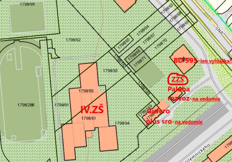 Situačná mapa účastníkov stavebného konania vo veci stavby ZZS, Gufero plus sro a Paluba rozvoz, ktorí dostali oznámenia písomne a bytový dom 595, ktorého obyvatelia a vlastníci bytov len vyhláškou / zdroj: katastrálna mapa