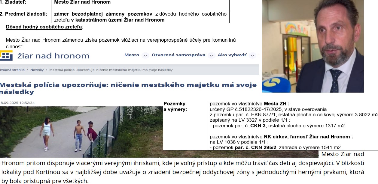 Najskôr sme sa dostali z dobrého zdroja k pomerne neuveriteľnej informácii, že na Kortíne sa stavia nové ihrisko. Najnovšie skutočnosti šokujúcu informáciu jednoznačne potvrdzujú. Tesne nad vchodom do Kortíny od Ul. Hutníkov sa objavil návoz zeminy na úpravu terénu. Deje sa tak na pozemku Rímskokatolíckej cirkvi, farnosť Žiar nad Hronom. Čo s tým má vedenie mesta? Na včerajšom mestskom zastupiteľstve (24.9.2025 v bode 5a-17) poslanci bez najmenšej hanby potichu a poslušne bez zbytočných otázok schválili Antalom predložený návrh zámeru zámeny pozemkov medzi mestom (1317 m2 v hodnote 77 300 Eur) a Rímskokatolíckou cirkvou, farnosť Žiar nad Hronom (1541m2 v hodnote 75 400 Eur). V dôvodovej správe k tejto zámene sa doslovne uvádza: „Mesto Žiar nad Hronom zámenou získa pozemok slúžiaci na verejnoprospešné účely pre komunitnú činnosť.“ Na stránke mesta si pozorní čitatelia mohli v článku z 18.9.2025 prečítať, že „V blízkosti lokality pod Kortínou sa v najbližšej dobe uvažuje o zriadení bezpečnej oddychovej zóny s jednoduchými hernými prvkami, ktorá by bola prístupná pre všetkých.“