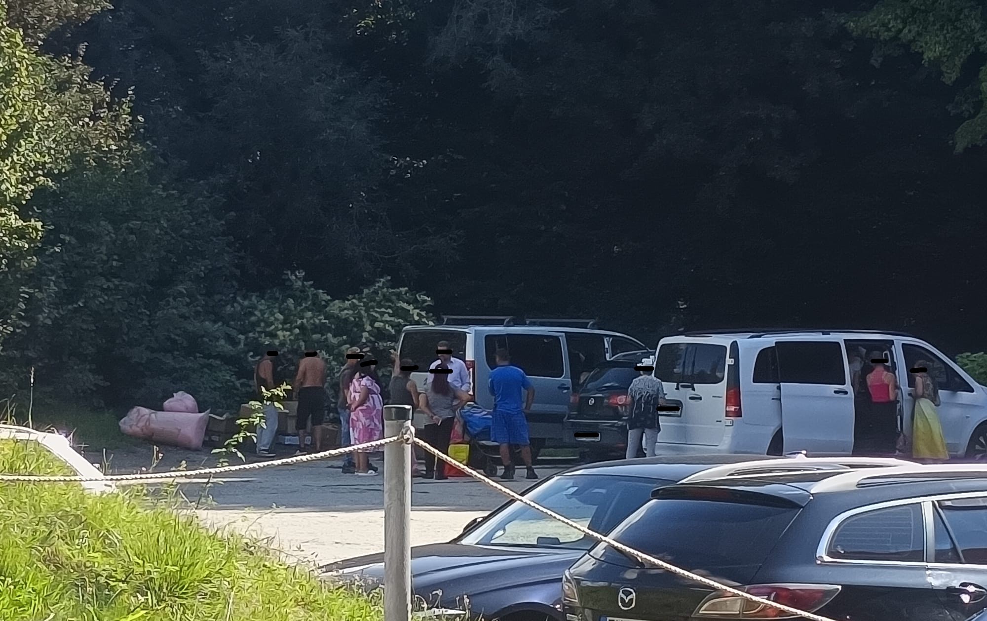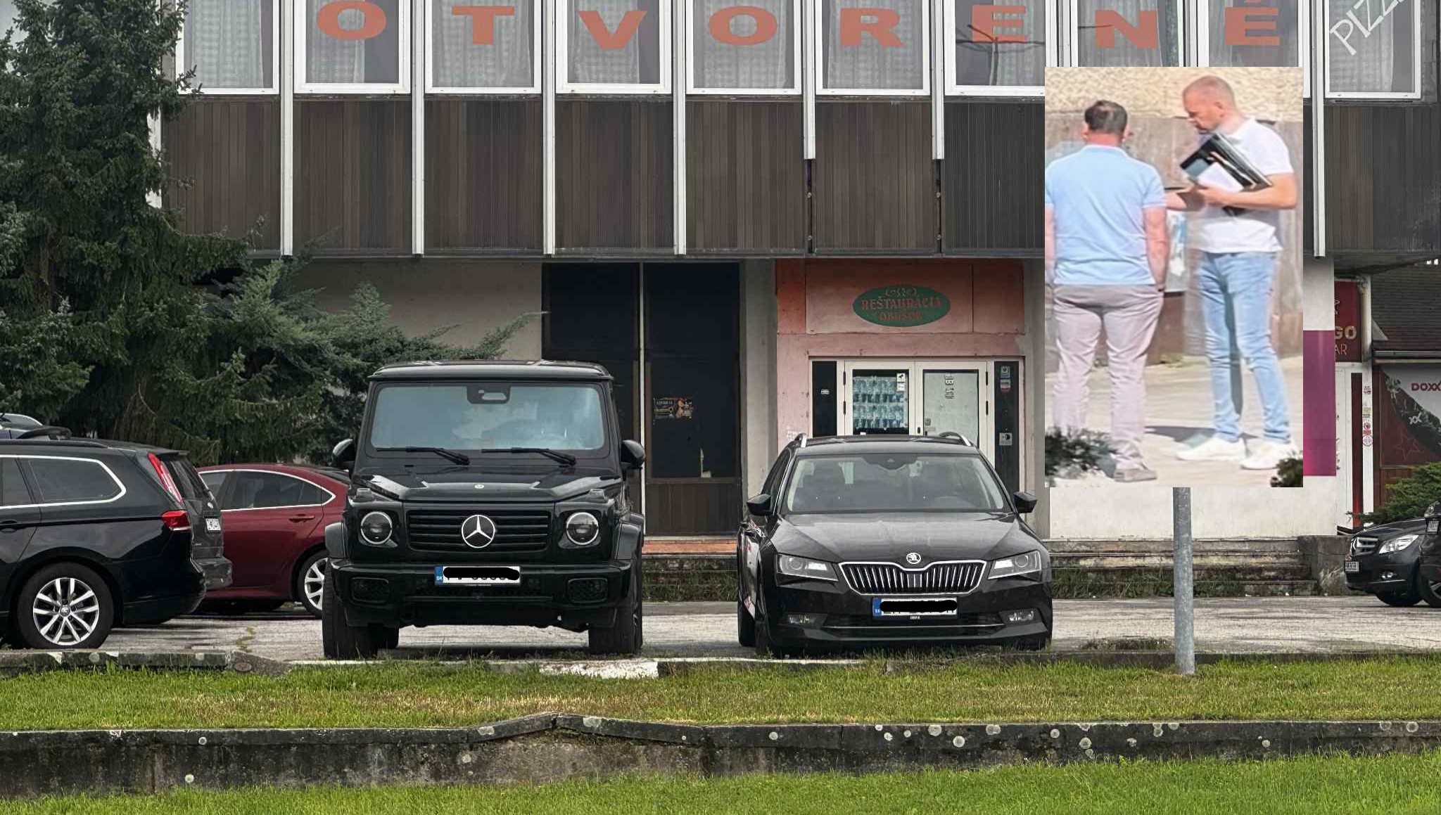 Obr. nižšie: Zvážanie Rómov do Žiaru nad Hronom na jeseň 2025 a parkovanie áut kamarátov a spolupodnikateľov Petra Antala a Petra Vasila pri zasadnutí Mestského zastupiteľstva a ich spoločná fotografia na žiarskom námestí / zdroj: Pravda o Žiari