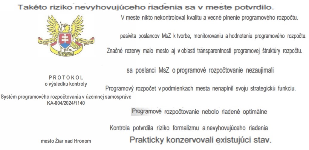 - V bode 9c zobrali bez poriadnej diskusie poslanci na vedomie výsledky kontroly Najvyššieho kontrolného úradu Slovenskej republiky. Kontrola rozpočtovania mesta Žiar nad Hronom prebehla od 16.4.2024 do 12.9.2024. Pre vedenie mesta skončila pomerne katastrofálne. Správa má až 8 kontrolných zistení. Pre Petra Antala ako primátora mesta a Martina Majerníka ako ekonóma mesta je to však v terajšej zúfalej situácii bohužiaľ len zdrap papiera... Prinášame z nej ale pre ilustráciu pre verejnosť aspoň pár útržkov: