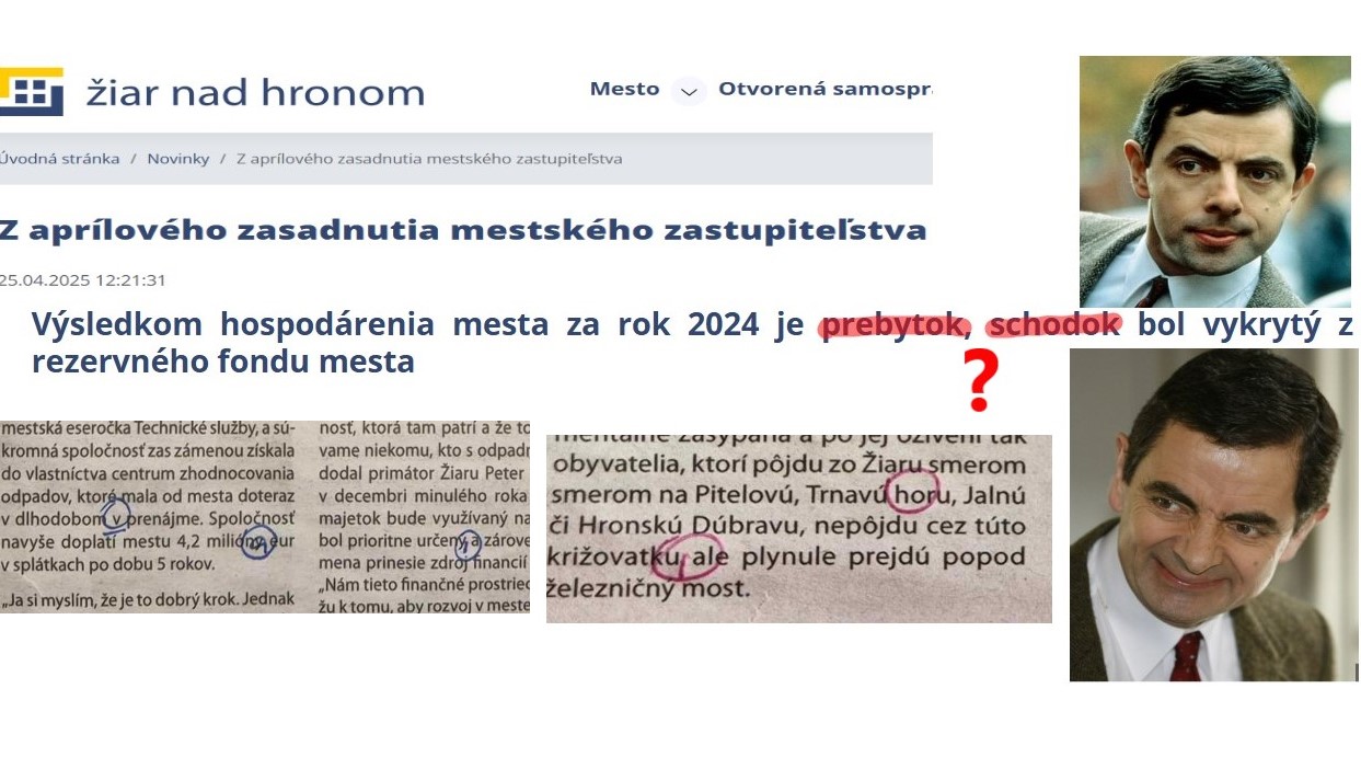 .) Keď dostanú takíto jednoduchší pracovníci od primátora príkaz, napíšu na web mesta alebo do Mestských novín čokoľvek. Ukážka gramatických chýb v Mestských novinách a totálneho klamsta a hlúposti na webe mesta je hore na obrázku. „Výsledkom hospodárenia mesta za rok 2024 je prebytok, schodok bol vykrytý z rezervného fondu mesta“. Ono aj klamať treba vedieť. Lebo toto znie ako „suchá voda“ a keby to nebola oficiálna informácia z MsZ v mestskom médiu, bolo by to na smiech. Mesto skončilo rok 2024 opäť len a len schodkom a rezervný fond je preč. Ale toto keby redaktorka mestských novín napísala, okamžite by ju odpratali. So šťastím napríklad na mestské Technické služby...
