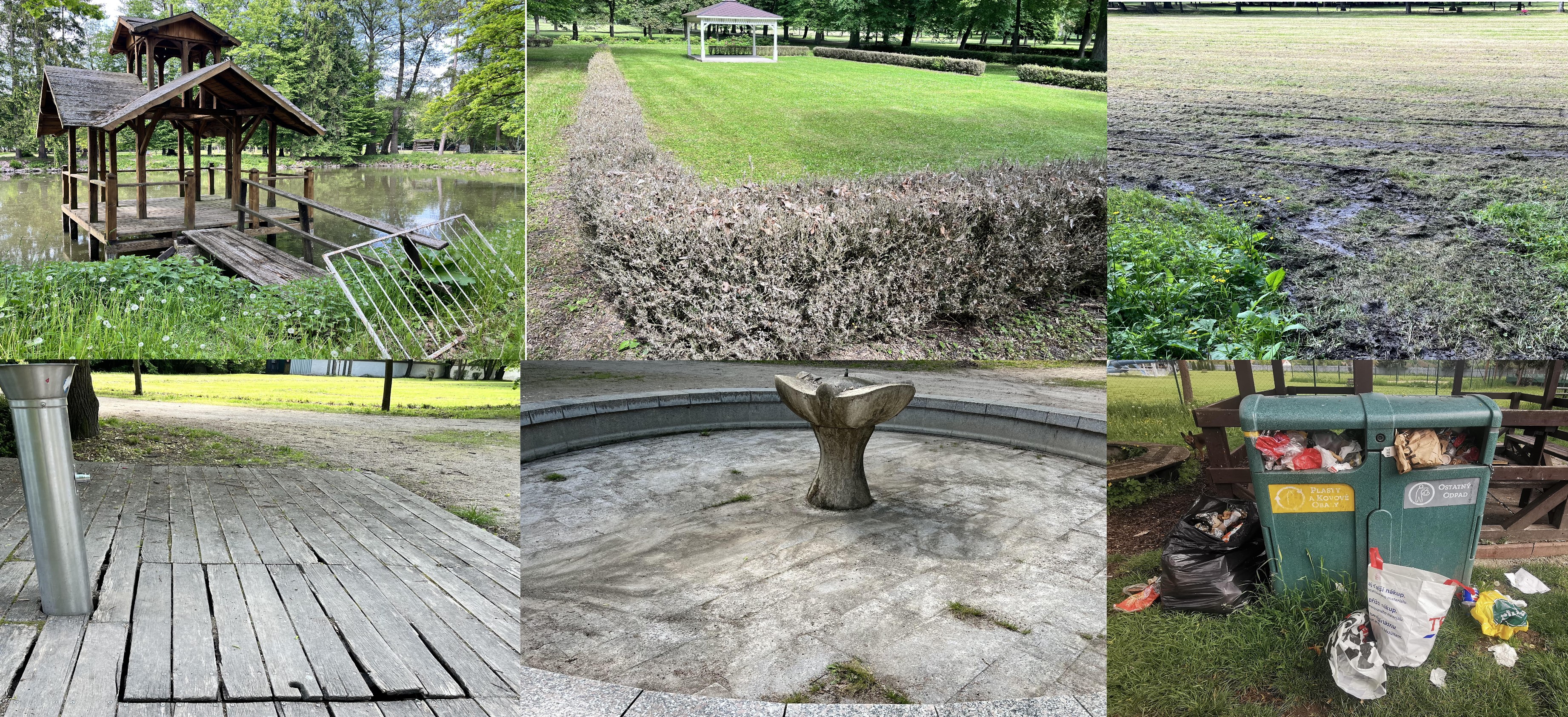 Vstup do altánku v jazierku v minizoo je prehradený spadnutou kovovou zábranou. Schátraný, s rozpadnutým mostíkovým vstupom len spomína na svoju minulú krásu a predvolebný sľub primátora o jeho rekonštrukcii z 18.mája 2020. Park je plný popadaných konárov, tráva narýchlo traktorom pokosená až do hliny. Smetné koše preplnené a nevysypané. Nefunkčná fontána len narýchlo vyzametaná, s vyrastajúcou trávou. Drevené pódium s nakloneným kohútikom pitnej vody sa rozpadáva a vyzerá nebezpečne. Krásny zelený živý plot z krušpanu je miestami úplne vyschnutý a svadby pod bielym altánkom už skrášľovať určite nikdy nebude.