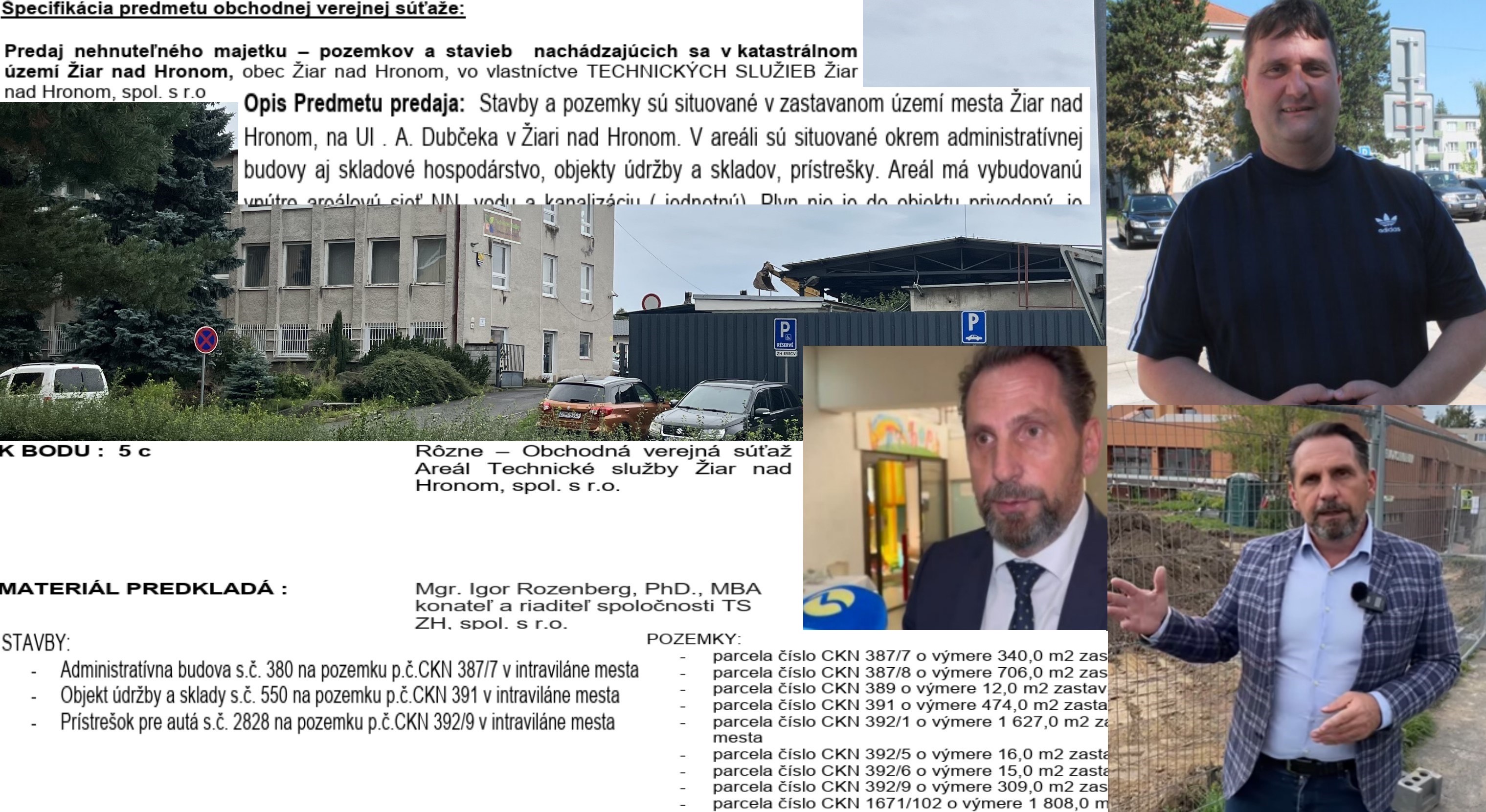 Obr.2: Predávaný „prebytočný majetok“, areál mestských Technických služieb a materiály s tým súvisiace a predložené do MsZ 24.9.2025, konateľ Igor Rozenberg a jeho jediný šéf primátor Peter Antal / zdroj: Pravda o Žiari, web mesta, reportáž TV Markíza december 2024 a FB Peter Antal- Primátor Žiaru nad Hronom